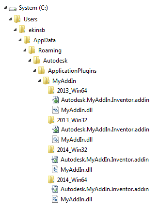 The above image is from the Inventor help docs and shows an example of this structure. It would be nice if there was a way to automate these directory structures and more importantly, automate the updates of the addin files to correctly reflect which version of Inventor to load into.
